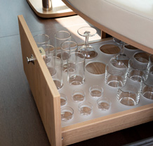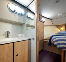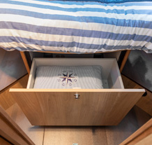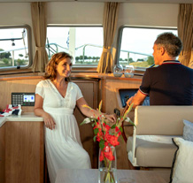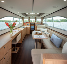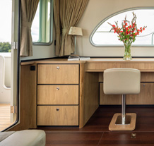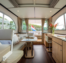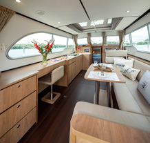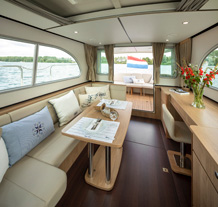 De L-vormige salonbank is bijzonder vanwege de vele gedaantes die deze eenvoudig kan aannemen. Allereerst is het natuurlijk een comfortabele bank. Door de tafel deels weg te schuiven onder de desk aan stuurboordzijde, is het mogelijk met behulp van het Easy Sleep Convert System ook een slaapbank van te maken. Afhankelijk van de wensen en het aantal opvarenden kan een optimale interieuropstelling gecreëerd worden.