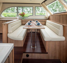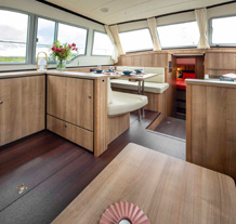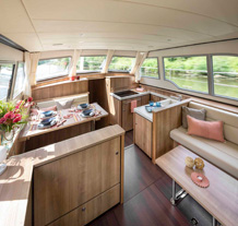 In de salon is de trappenpartij van en naar het achterdek vernieuwd. Deze wordt onderaan breder voor meer comfort. Samen met de verticale handreling biedt dit optimale veiligheid. De achterwand in de salon is ook aangepast. Daarnaast valt van binnen natuurlijk meteen de ramenpartij op. Zo mooi en stijlvol als deze er van de buitenkant uitzien, zo licht en ruim oogt deze van binnenuit.
