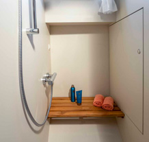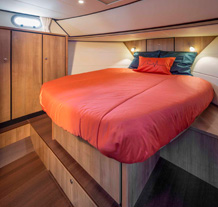 De ‘master cabin’ van de Grand Sturdy 40.0 AC Intero is ge-redesigned. Hierdoor is er nog iets meer ruimte ontstaan rond het bed en is er een mooie inloopkast aan bakboord naast de toilet/douche-combinatie.