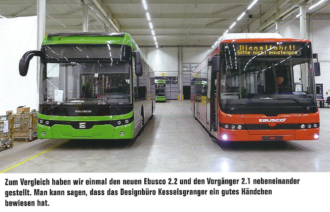 Conceptueel heeft EBUSCO geen middel onbeproefd gelaten en met hun eigen team een compleet nieuwe bus ontwikkeld - de generatie 2.2. Het doel van het creëren van een elegant en aantrekkelijk voertuig is door het Nederlandse bedrijf inderdaad bereikt. Het nieuwe exterieur- en interieurontwerp evenals de bestuurderscabine zijn gemaakt in samenwerking met het Belgisch / Nederlands ontwerpbureau KesselsGranger DesignWorks.