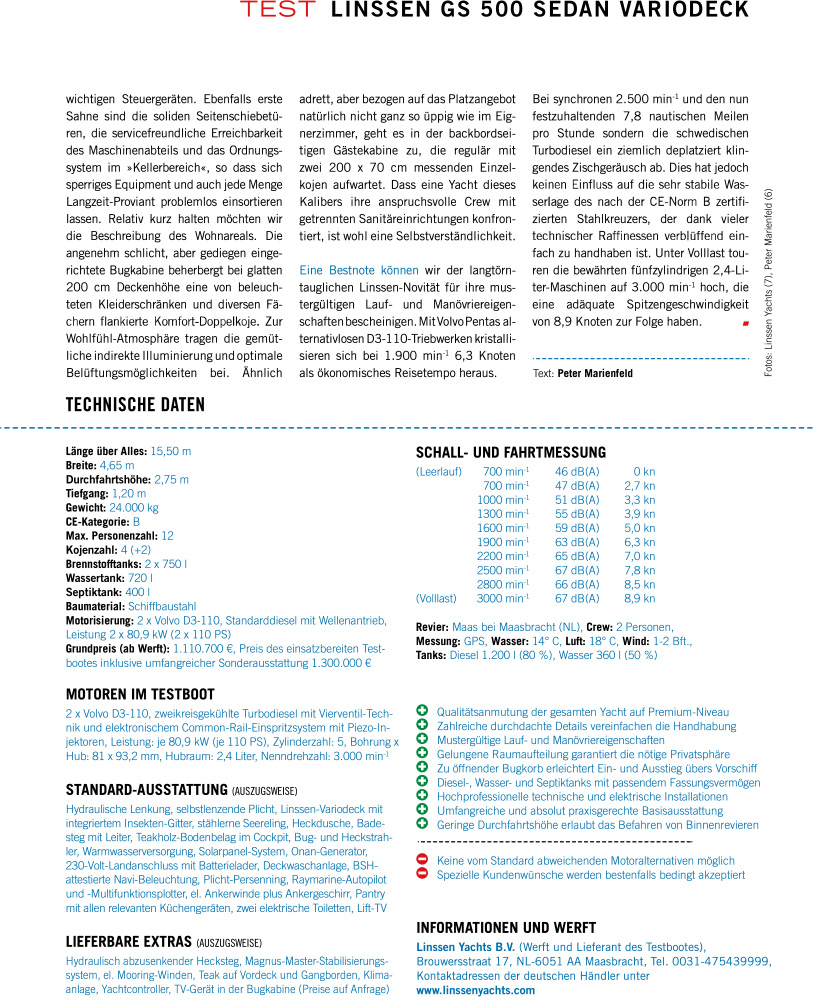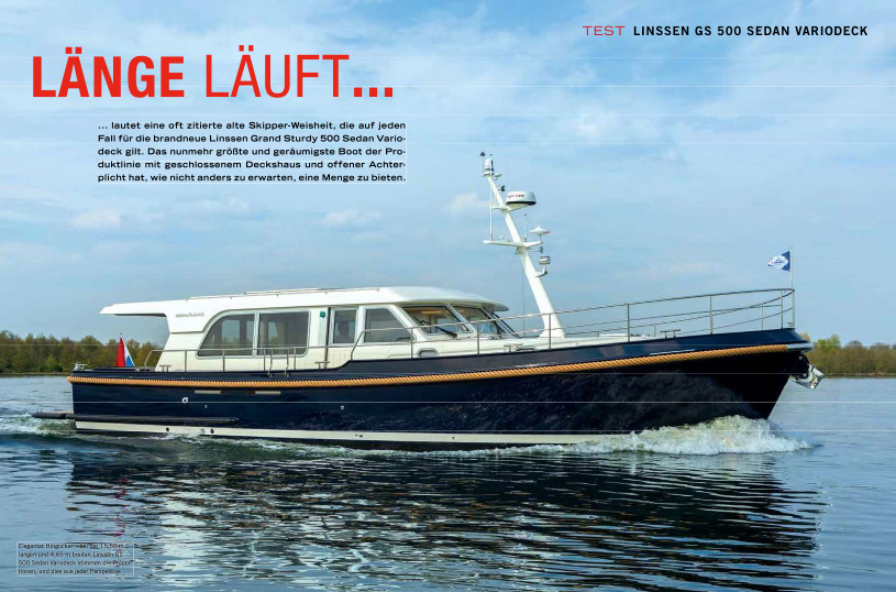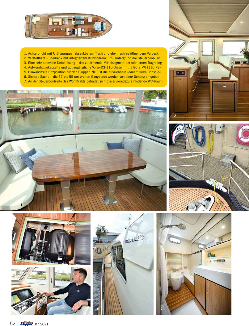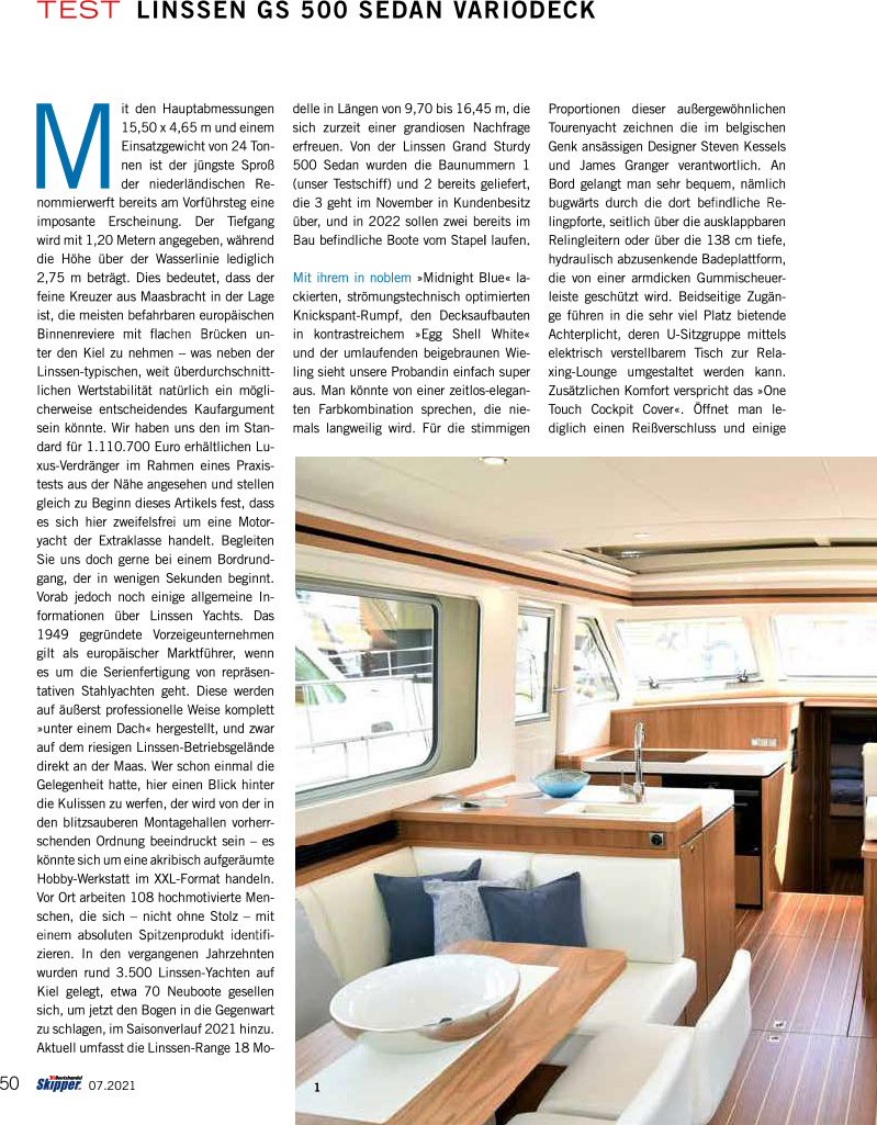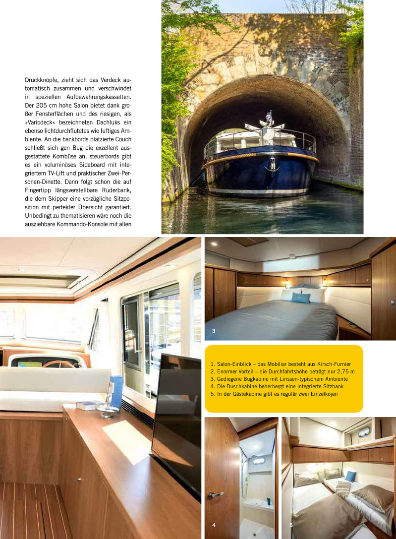 "Met haar gestroomlijnde romp in stijlvol Midnight Blue, de bovenbouw in contrastrijk Egg Shell White en de beige-bruine deck eromheen, ziet onze testboot er gewoon geweldig uit. Men zou kunnen spreken van een tijdloos elegante kleurencombinatie die nooit verveelt. De Belgische ontwerpers Steven Kessels en James Granger zijn verantwoordelijk voor de harmonieuze proporties van dit buitengewone toerjacht."