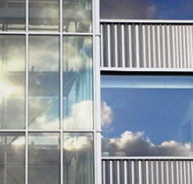 The entrances for both companies are located in the far corners of the building and are visually bridged together by a large hook-shaped frame. The corners are made entirely of glass.